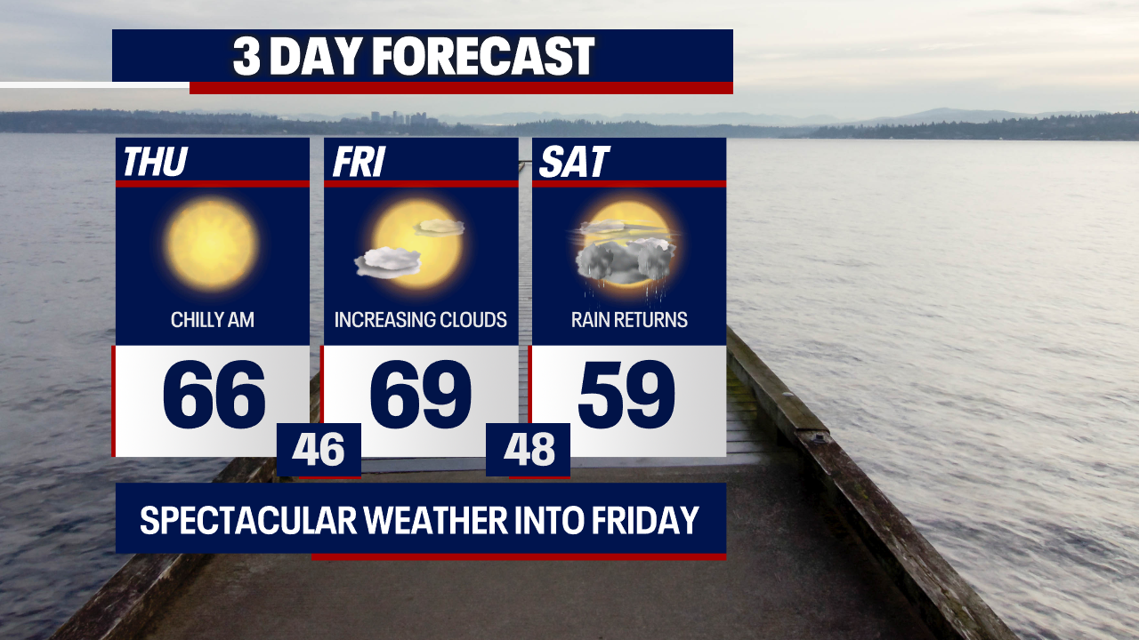 Seattle weather turns cooler Saturday as clouds increase and rain moves back into the forecast. (FOX 13 Seattle)