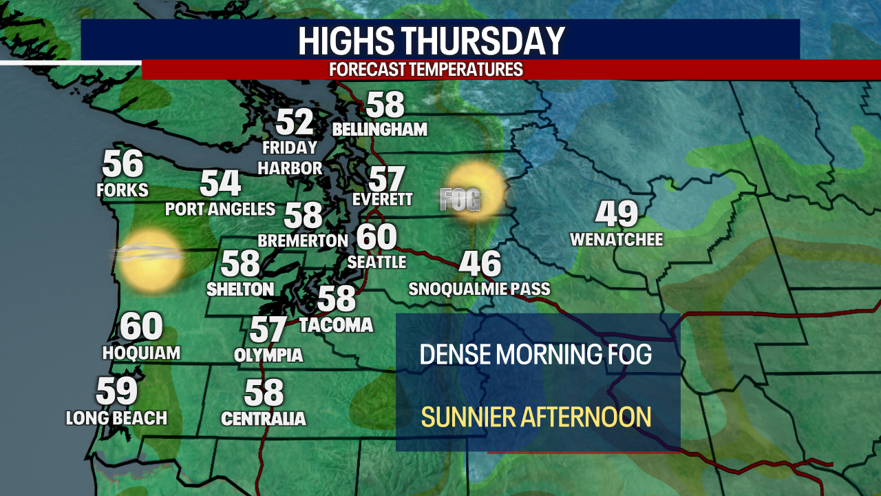 SEATTLE - The ridge of high pressure will continue to strengthen on Thursday, keeping skies mainly sunny and dry. Some spots, especially just east of the Cascades, will see early morning dense fog which will be slow to burn off.