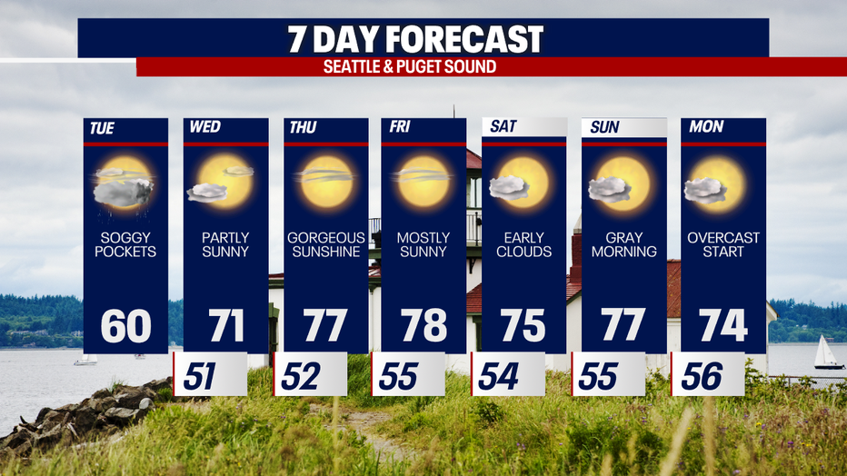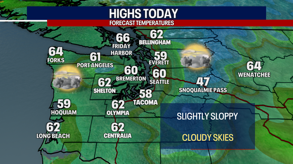 It's going to be a very cool day across Washington State as overcast skies and light showers hit the region. High temperatures will only make it into the upper 50s and low 60s. That's about 10 to 15 degrees below average for mid-June.