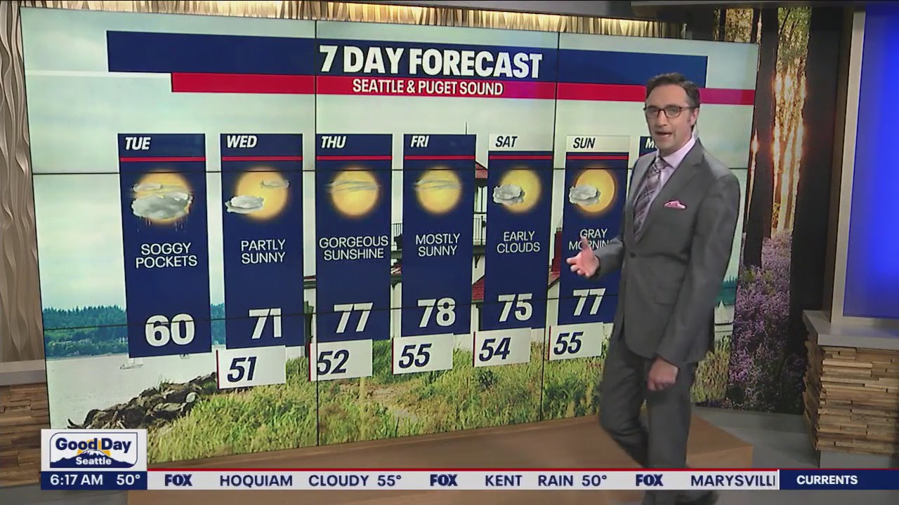 It's going to be a very cool day across Washington State as overcast skies and light showers hit the region. High temperatures will only make it into the upper 50s and low 60s. That's about 10 to 15 degrees below average for mid-June.