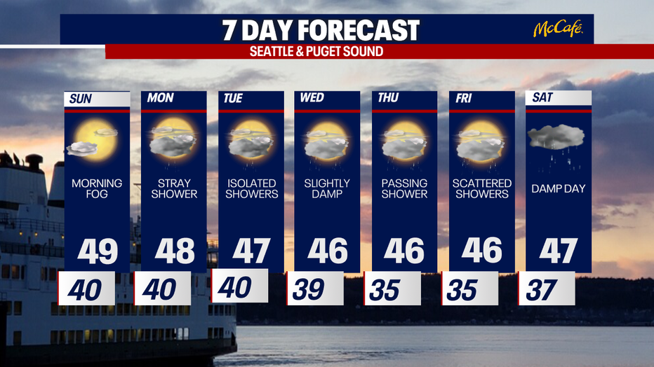 Sunday morning will start off with some fog once again. It will be more widespread in the South Sound with visibilities reduced to about 1 mile. Fog will burn off by the afternoon and we get another dry day to get outside on Sunday before slight rain chances are back on Monday.