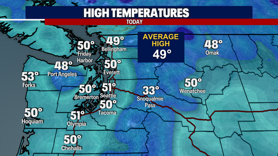 SEATTLE - After some morning fog burned off, we were lucky enough to enjoy some beautiful blue skies this afternoon. High temperatures were close to average with many spots in the upper 40s and low 50s. Hopefully you had a chance to catch our amazing sunset today!