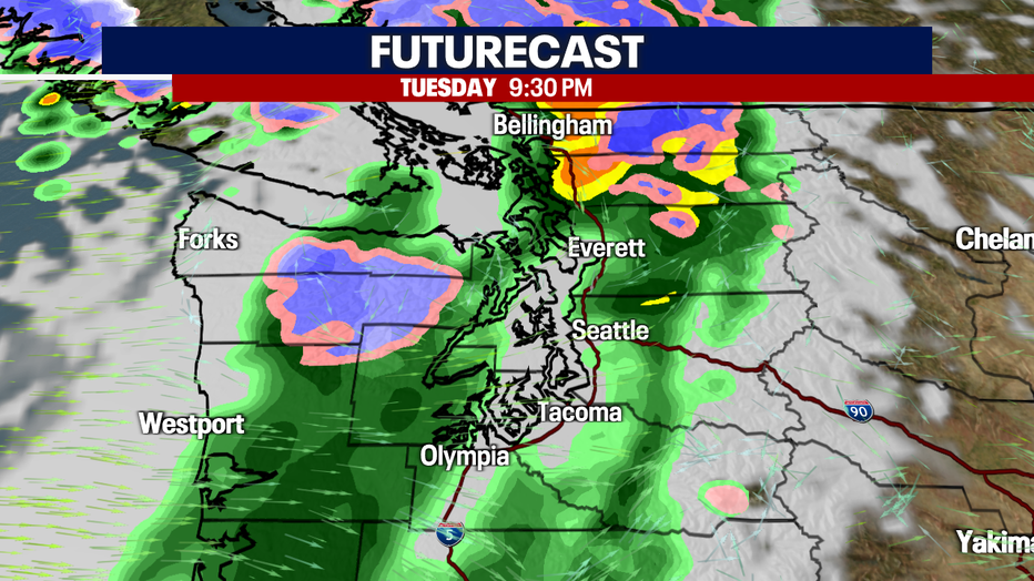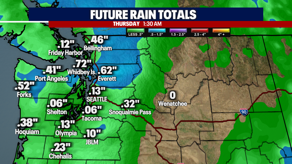 In the lowlands, a convergence zone will set up in Snohomish County for most of Wednesday. Rainfall amounts will range between about .10" to .75".