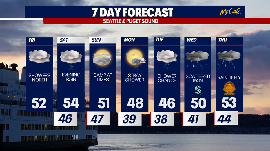 Western Washington will see mostly cloudy skies Friday, with highs in the low to mid 50s and some showers in the north