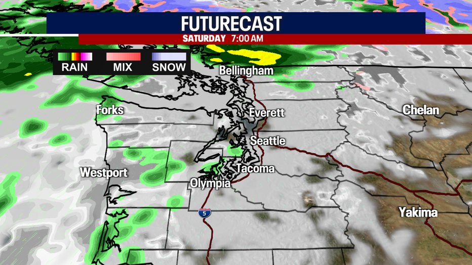 Saturday will be gray as well around western Washington. Rain will continue along the coast in the morning. By the evening, rain could develop farther south into Snohomish County, along with spreading into the Central Cascades. Damp weather could bubble up in the South Sound, too.