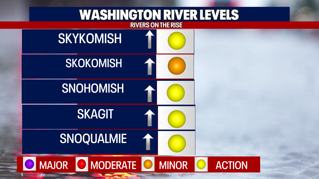 Snow levels will remain high, around 7500', with much of the precipitation falling as rain in the mountains. This will lead to a sharp rise in our area rivers, especially the Skokomish river near Shelton. Other area rivers will approach "action" stage.