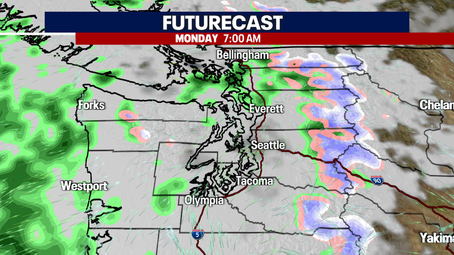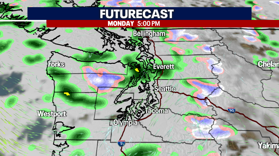 Waking up Monday morning, showers will be present, especially up north and along the coast. Mountain snow will also start with snow levels around 3,500'.