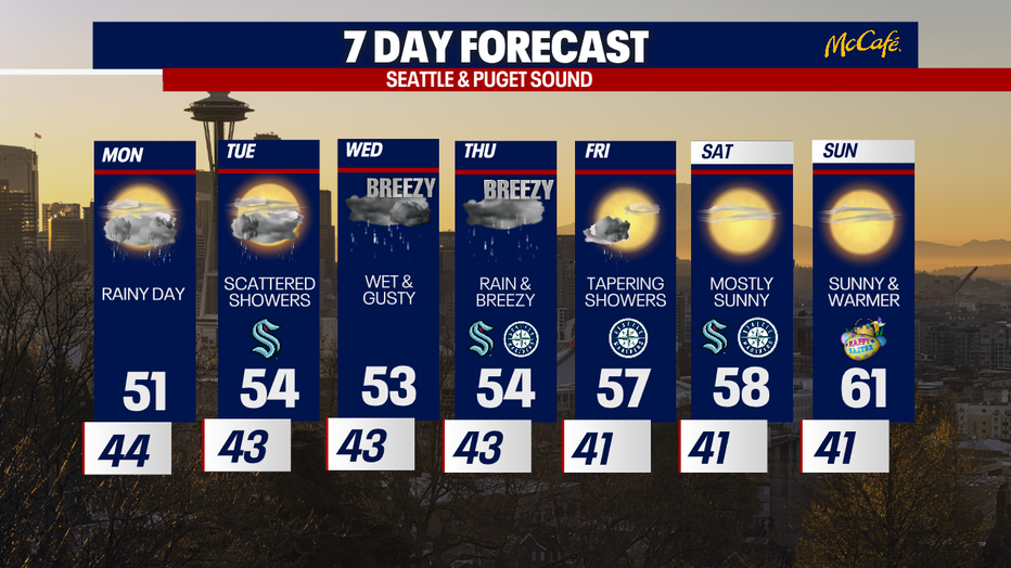 A stronger system moves into Western Washington on Wednesday, bringing more widespread rain, mountain snow and gusty winds. These conditions continue into Thursday. Tapering showers Friday with more sunbreaks in the afternoon. The weekend looks warmer and drier.