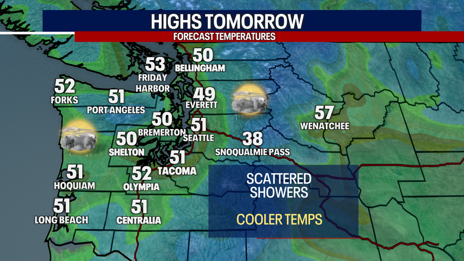 Highs on Monday will be cooler than Sunday, with more clouds and showers. The highs will top out in the low 50s.