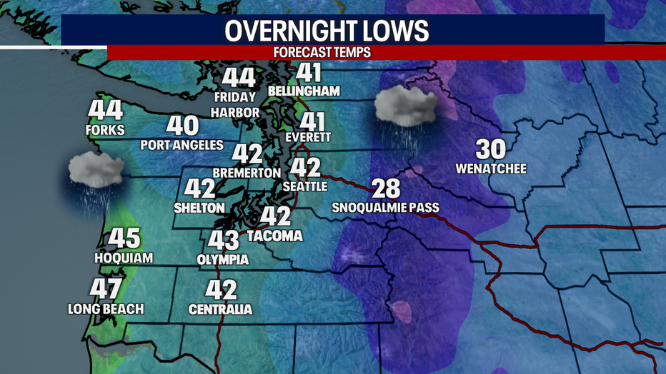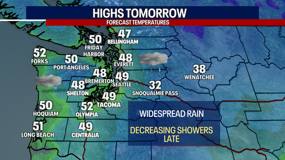 High temperatures will be in the upper 40s to low 50s. Milder temperatures for the south sound and along the coast.
