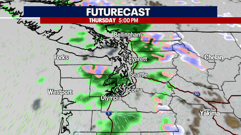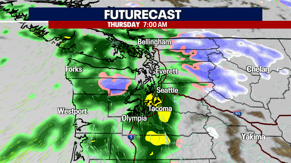 The heaviest rain will be in the morning Thursday with winds picking up throughout the day; winds 15-20 mph. Light snow will fall in the mountain passes; around 1-4 inches.