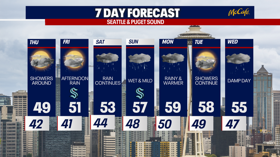 SEATTLE - A wet day for the Pacific Northwest with plenty of showers and a few inches of new snow for our high mountain resorts.