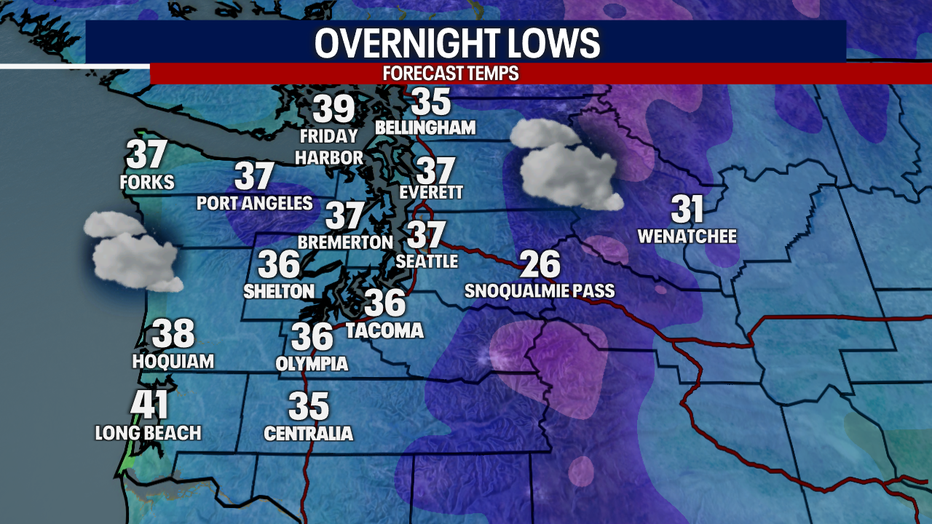 From Wednesday night into Thursday morning, we will see more cloud cover with an isolated shower chance. Lows in the mid to upper 30s.