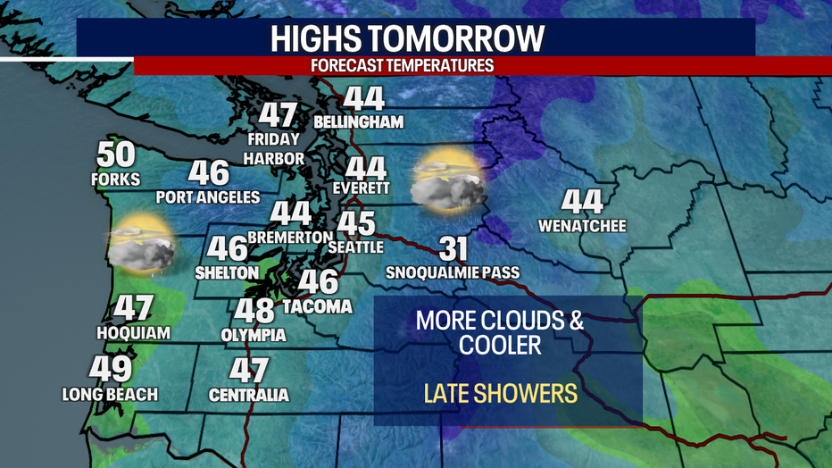 High temperatures will be slightly cooler Thursday, topping out in the low to mid 50s.