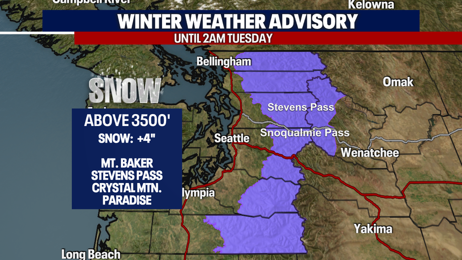 The Winter Weather Advisory remains in effect this evening through 2 a.m. on Tuesday morning. Up to 4 new inches of snow is possible above 3500'.