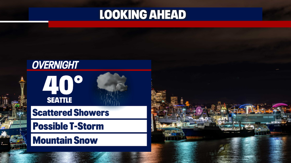 Scattered showers will bead around early Tuesday morning. Most of the rain will be from Seattle southward, with even rumbles of thunder possible.