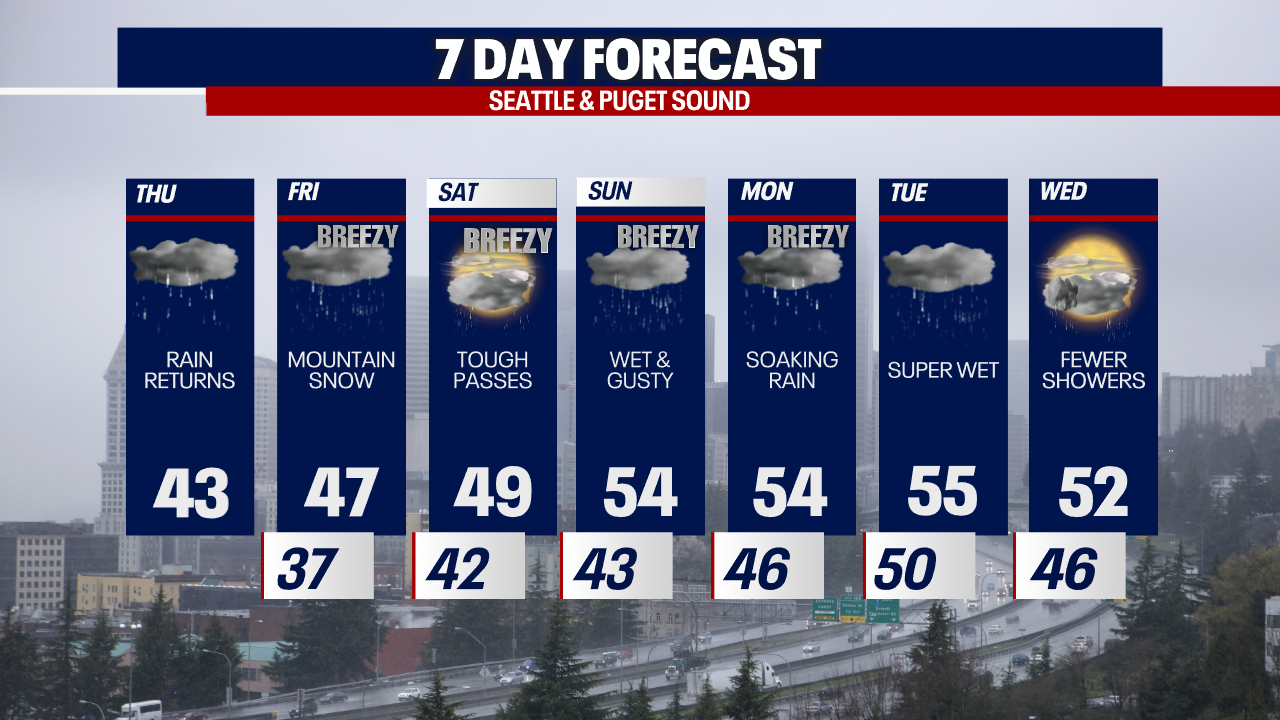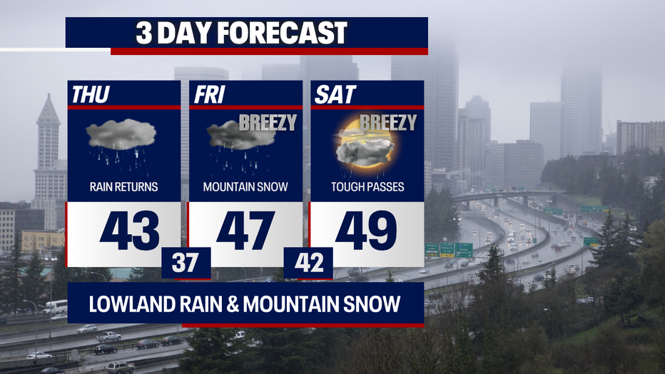 For today, you can plan on cloudy skies, highs in the low to mid 40s and the return of light lowland rain and mountain snow. Minor accumulations are expected at the passes during the daytime today.