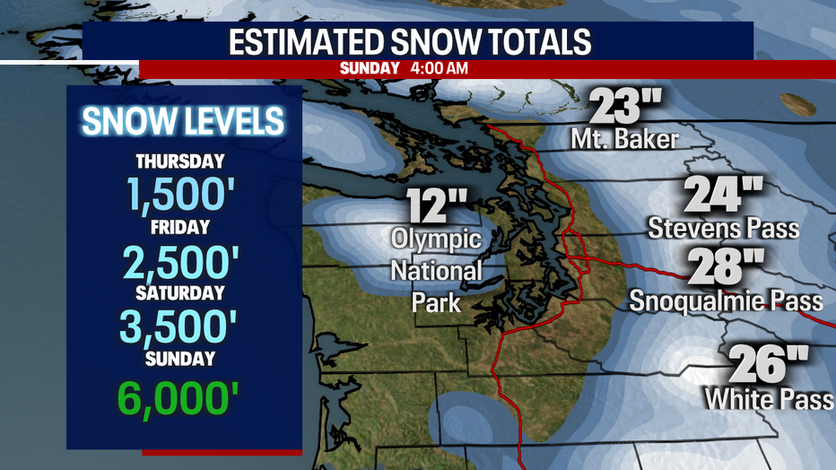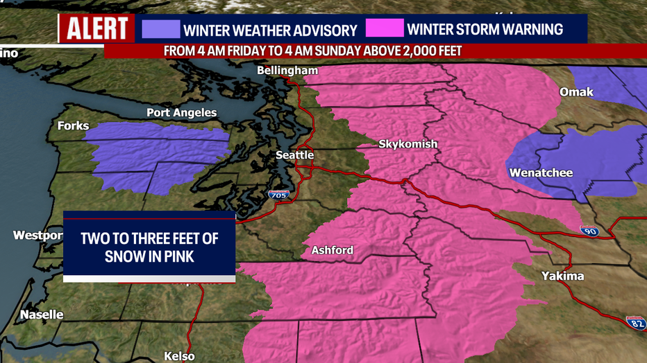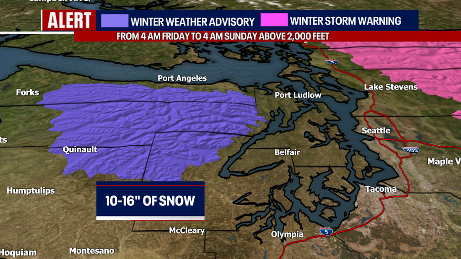 Mountain snow ramps up in a major way Friday and Saturday. Between two and three feet of snow could accumulate over the Cascades, including the passes. It's easy to see why the National Weather Service has posted a Winter Storm Warning for the Cascades above 2,000 feet in elevation from 4 a.m. Friday to 4 a.m. Sunday. Winds could gust to 40-50 mph. Over the Olympics, a Winter Weather Advisory is in effect for that same time frame for between ten and 16 inches of snow.