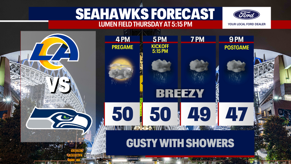 A wet pattern will persist around western Washington, but rain totals in the coming days won't be as intense as what we've endured in recent days. Keep the waterproof layers with you! The Hawks and Rams will be experiencing wet weather tonight.