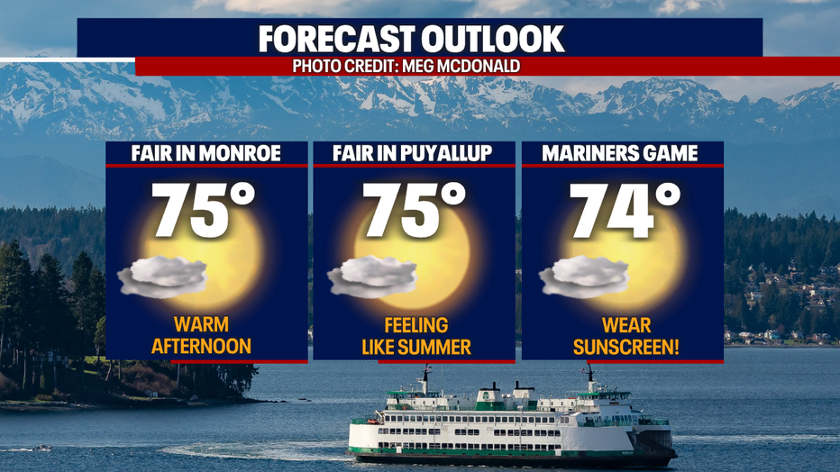 Whether you're headed to the Evergreen State Fair in Monroe, the Washington State Fair in Puyallup or the Mariners game at 3:40, you can plan on warm, sparkling sunshine.