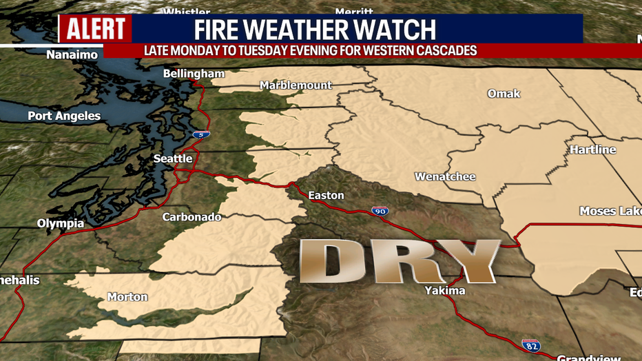Unfortunately, fire danger will be elevated this week, too. In fact, there's a Fire Weather Watch for the western slopes of the Cascades above 1,500 feet from late tonight to Tuesday evening. This alert continues in Eastern Washington from Tuesday evening to Wednesday evening.