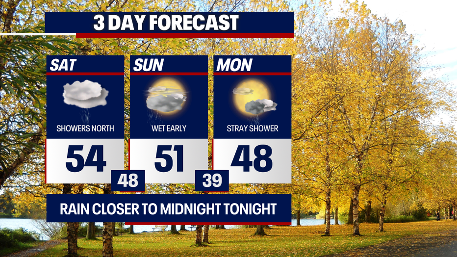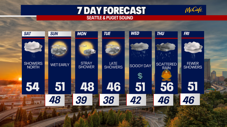 SEATTLE - The latest forecast for Thanksgiving week in Seattle features occasionally dark and soggy skies with fleeting sunbreaks. For this weekend, you can plan on mostly dry weather during the daylight hours. On Saturday, rain will develop in the North Sound and the North Coast.