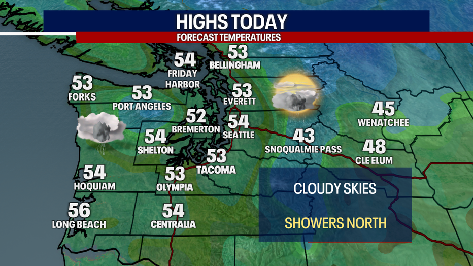 Outside a stray shower on Monday, drier weather will prevail. After a frigid start to the day as lows plunged to the upper 30s in Seattle, highs will only recover to the upper 40s by the afternoon. Monday will be the sunniest day of the week — and even then, there will be a healthy mixture of clouds. Enjoy the glimpses of sunshine while we have it!