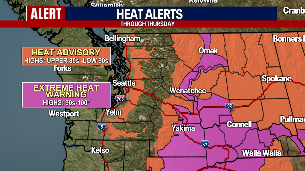 SEATTLE - It was a warm and sunny day for western Washington with high level smoke and highs in the 70s and 80s. A Heat Advisory remains in effect through Thursday for the cascade foothills and an Extreme Heat Warning for central and eastern Washington.