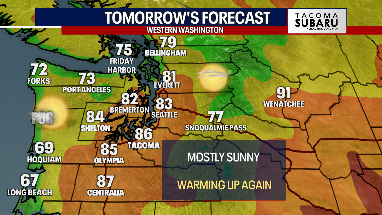 Highs will warm a few degrees again Thursday, with temperatures back into the 80s for the Puget Sound. Mostly sunny skies into the afternoon, with a few shower chances north.