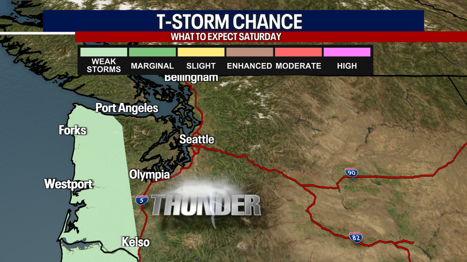 The next frontal system will move through Saturday morning, bringing scattered showers across Western Washington. By the afternoon, there will be the potential for t-storms, especially along the coast.