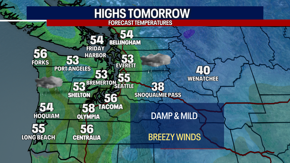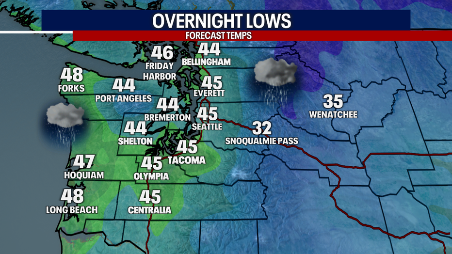 Temperatures tonight will range in the mid to upper 40s, with highs tomorrow back into the 50s.