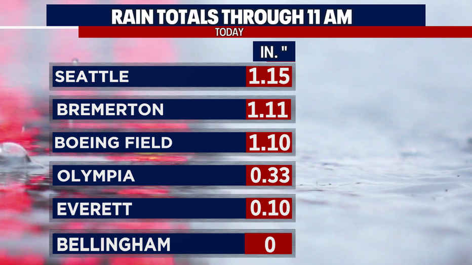 Take a look at the rain totals recorded until 11 a.m. At the National Weather Service office in Seattle, more than an inch was recorded before noon. While the rain wasn't always torrential, the constant and stationary nature of the wet weather made driving a real challenge.