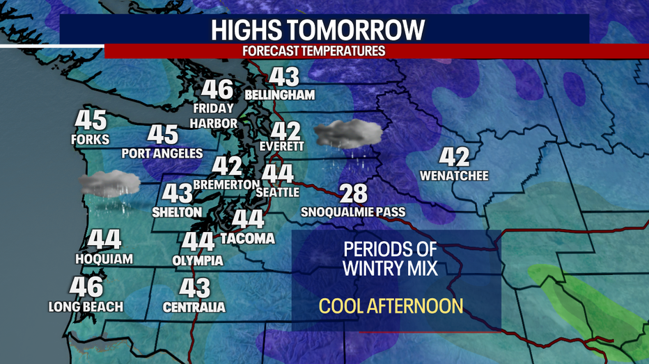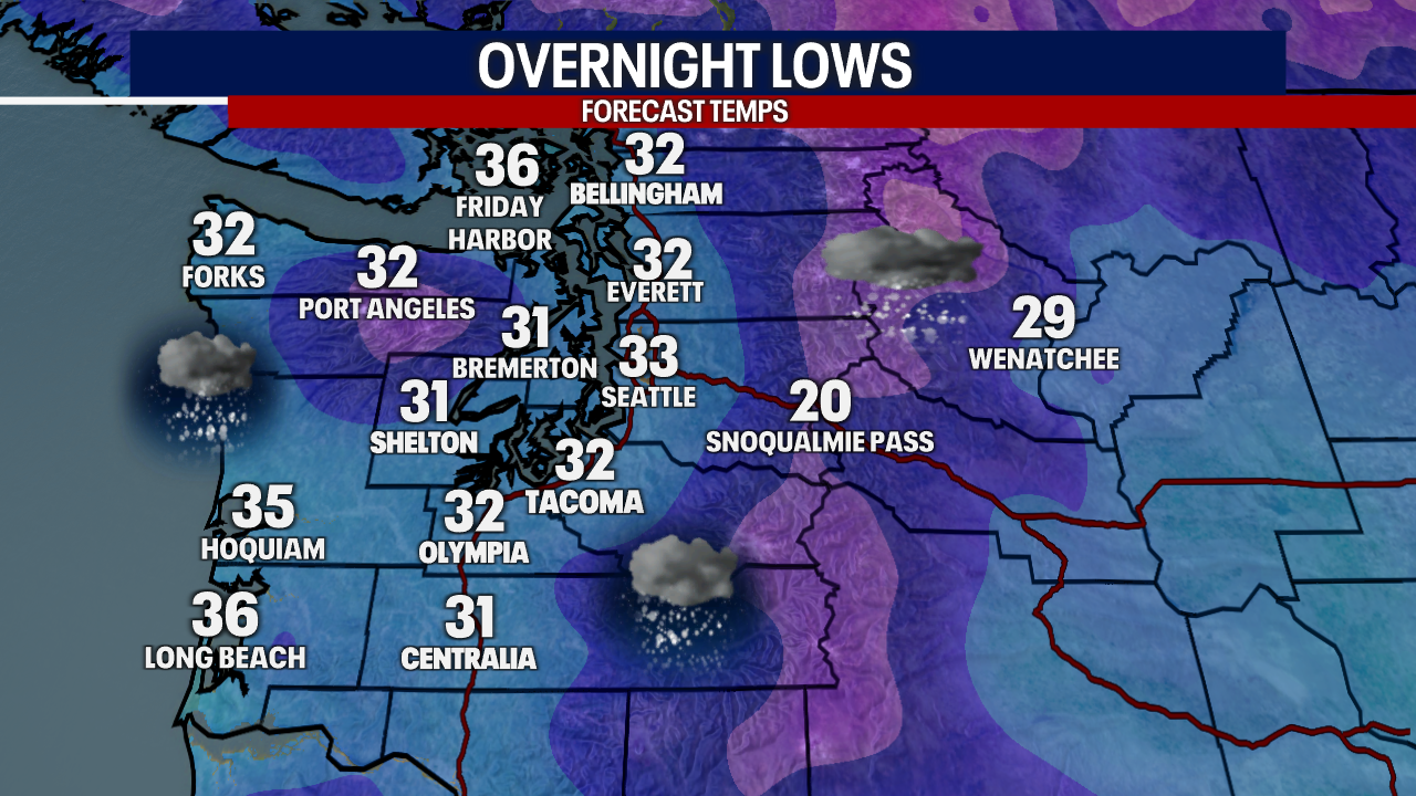 Afternoon highs are still trending about 5-10 degrees below average. A chilly night is ahead with lows near freezing in much of Western Washington.