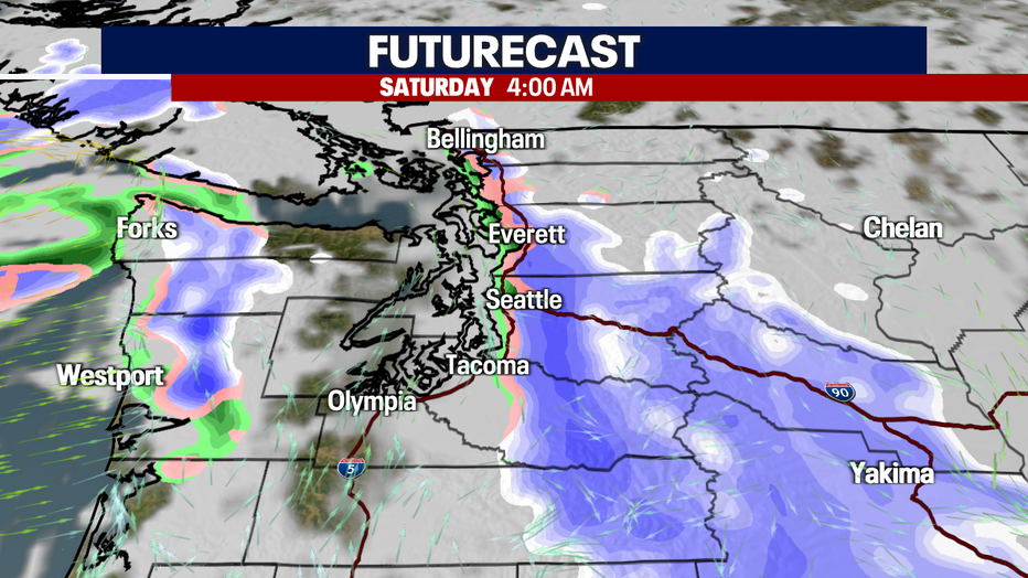 A disturbance is hanging out just off the coast over the Pacific Ocean. Moisture will move from the south to the north overnight Friday and into Saturday. The low snow levels and chilly temperatures will again allow for patchy spots of a wintry mix. While no accumulations in the lowlands are expected, some of our higher foothill communities may see a light dusting by morning.