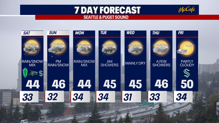 Afternoon highs will be cool, hovering in the low to mid 40's. We have a lot of events around Western Washington this weekend including Comic Con, the Kraken game and the return of the Sounders and Seawolves home openers.