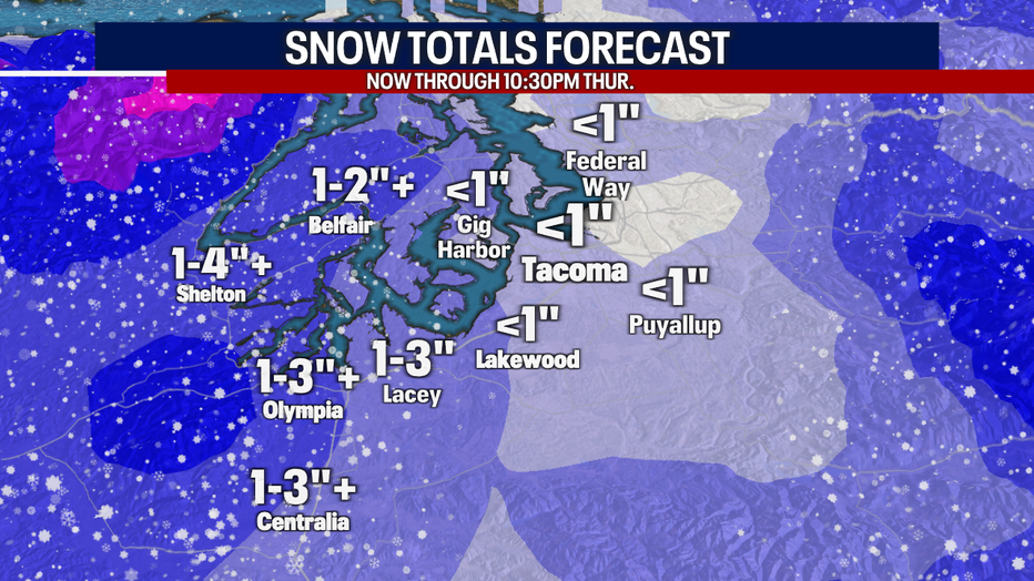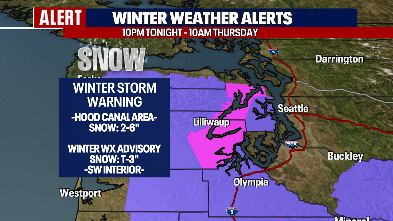 Winter Storm Warning until 10am Thurs. for the Hood Canal area. Snow: 2-6".