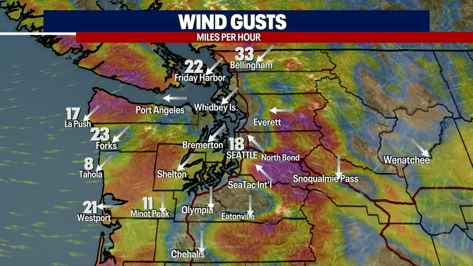 Winds are going to be breezy tonight for the Fraser River Outflow near Bellingham and through the Cascade gaps. Winds will stay gusty into Thursday morning.