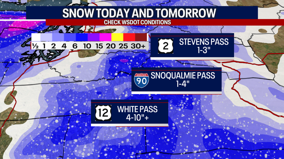 Several inches of snow are expected for the Cascade mountains, especially the south Cascades. The heaviest snow will be for White Pass with up to a foot of snow possible.