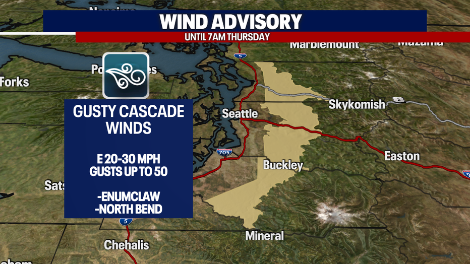 A Wind Advisory is in effect the East Puget Sound Lowlands through 7am Thursday. Wind gusts up to 50mph, especially strong winds around Enumclaw and North Bend.