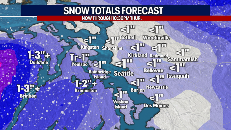 Snow totals tonight through Thursday morning look relatively light, especially for the Seattle Metro area, which will likely see trace amounts of snow. The best chance for snow accumulation will be to the west of Puget Sound and the south interior.