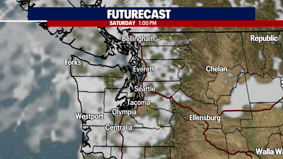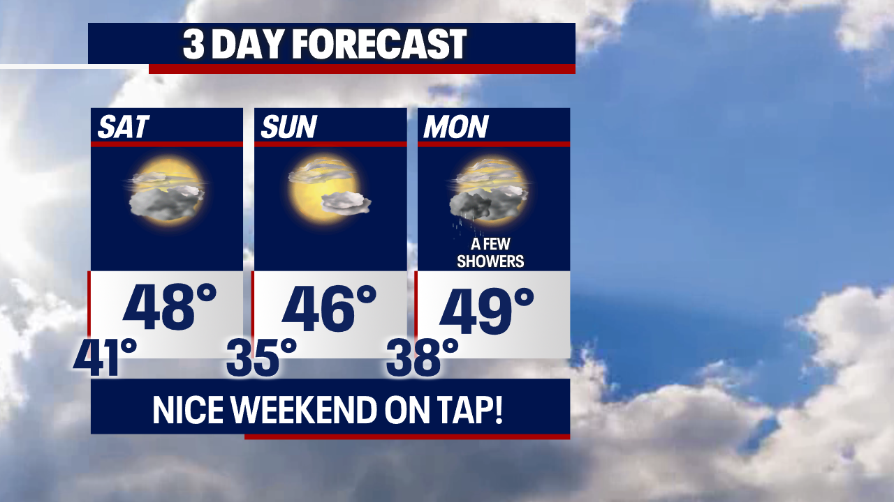 By midday Saturday we'll see clouds breaking apart for filtered sunshine.