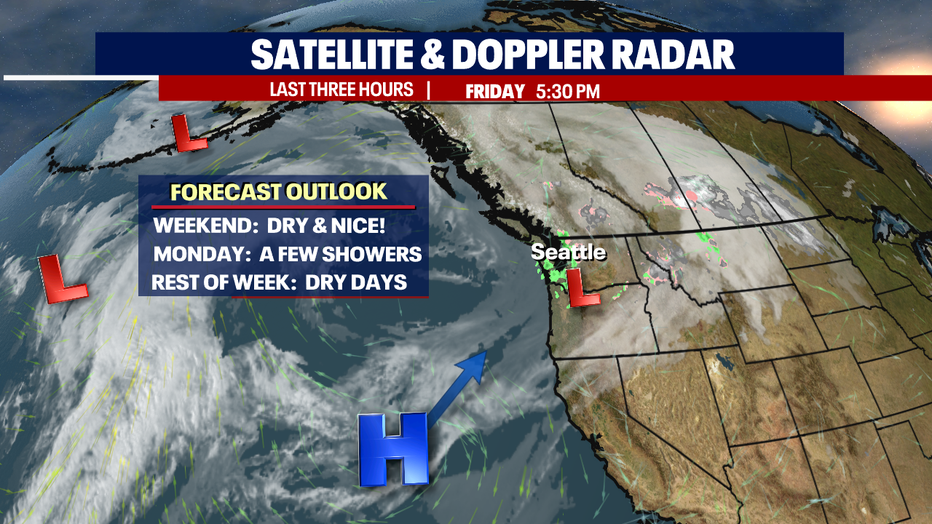 High pressure is now building in and will hand us a pretty decent weekend! Saturday and Sunday will be dry with more sunshine each day. By Monday, a weak front will slide over the area dropping in light showers early in the day. Most precip will fall over the coast, mountains, and North Sound. Otherwise, look for ridging to build back in for the rest of the week leaving us with a nice and mostly dry forecast.