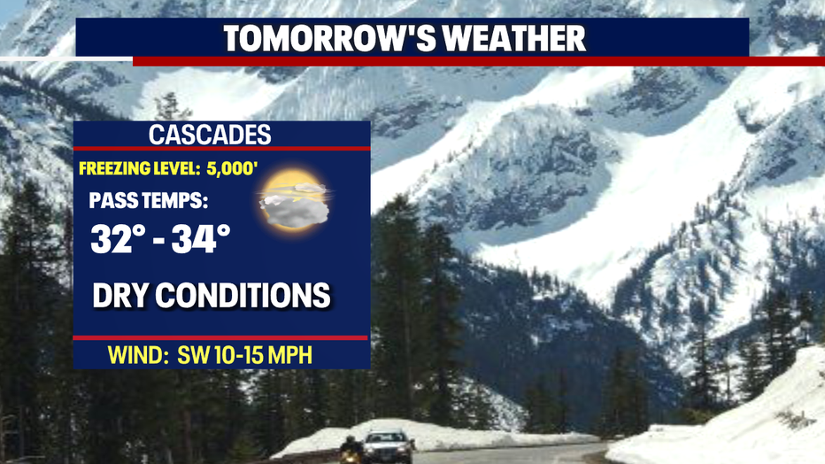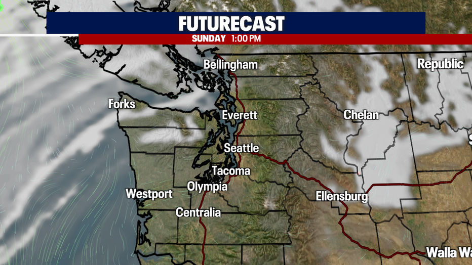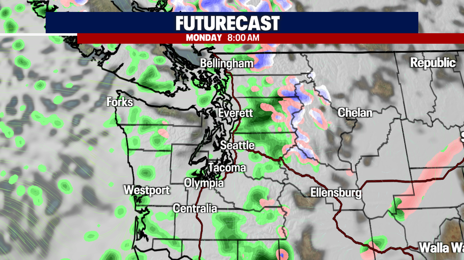 By 8am Monday showers will start to become scattered with most of the bulk of the system pushing into the Cascades.
