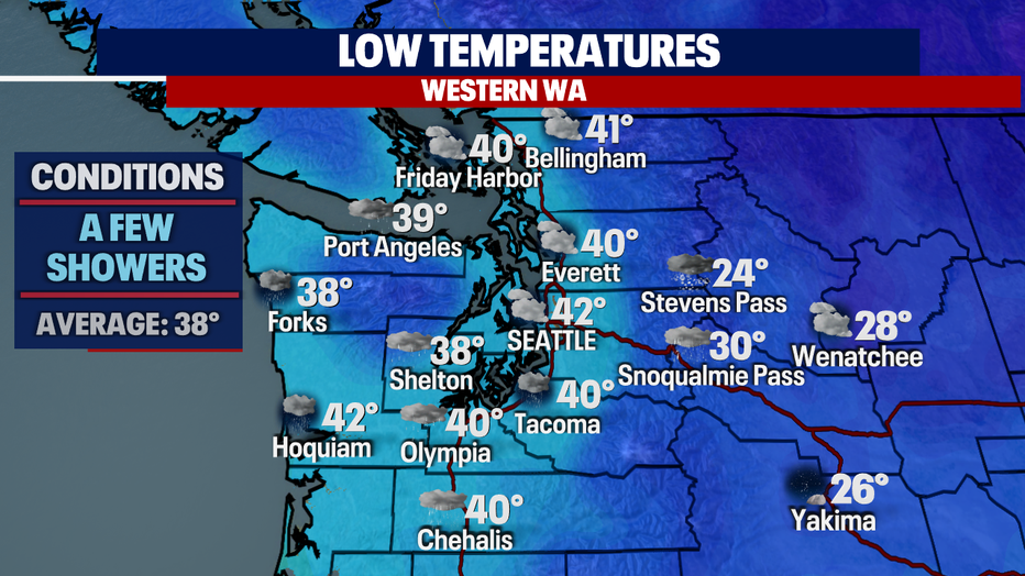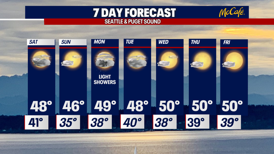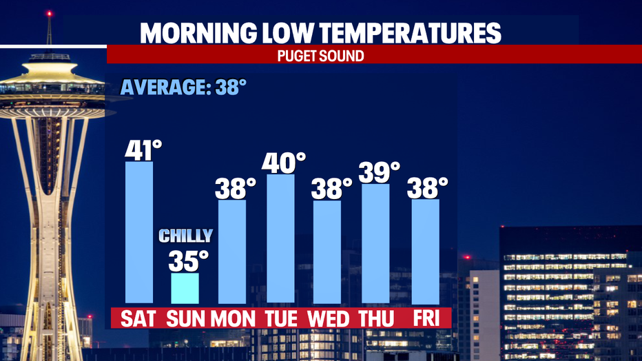 Temperatures will hang very close to average for this time of year except for early Sunday morning where we'll be waking up to lows near freezing for many. Seattle starts the day around 35 with temperatures finding their way into the mid 40s.