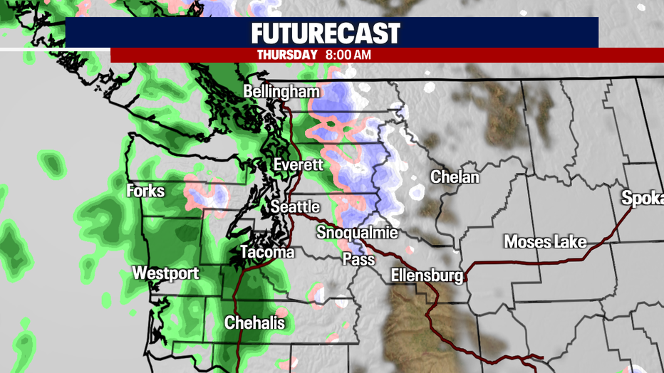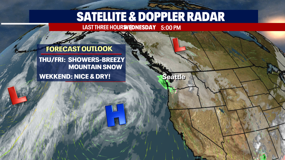 A peek into the cold front heading our way Friday has rain taking over the radar through the lowlands with snow in the mountains. Winds will become breezy at times with this system too. By the evening commute rain will wrap up leaving us with a few lingers showers around the region.