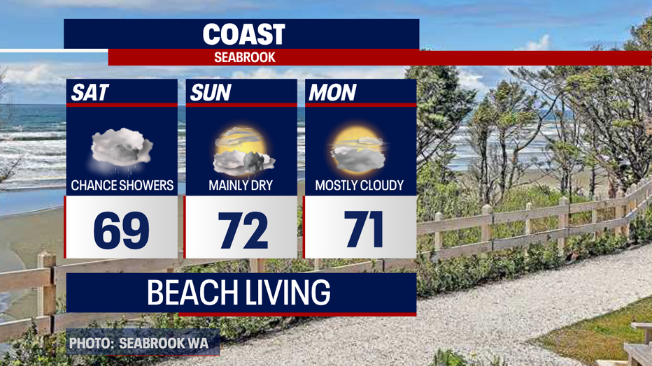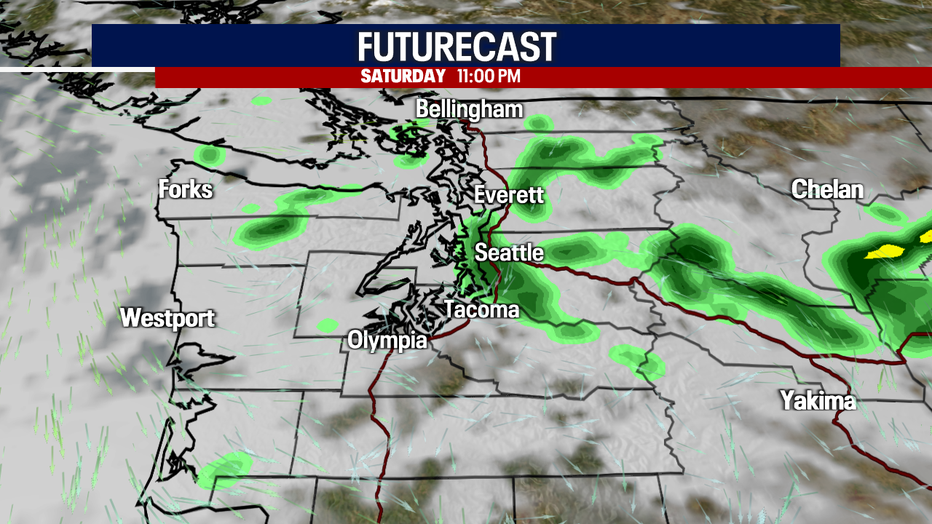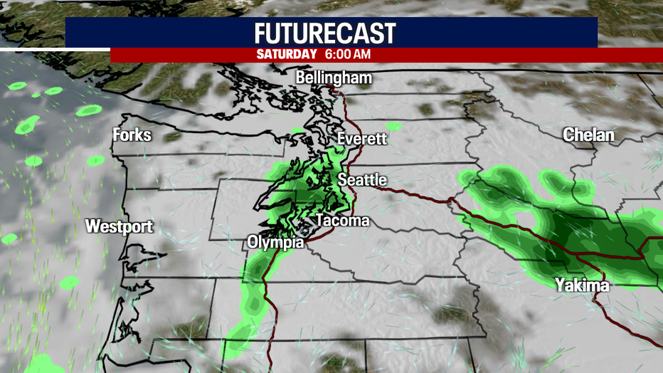 Most of us will stay dry Saturday with filtered sunshine. Highs cool into the 70s for Western WA. Areas at the coast into Hoquiam and Aberdeen start with areas of patchy fog.