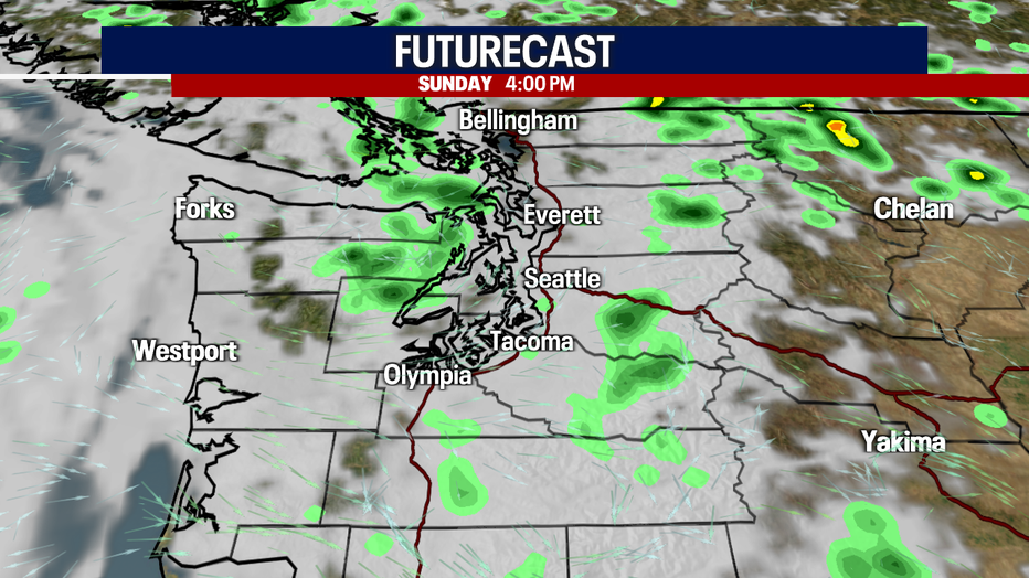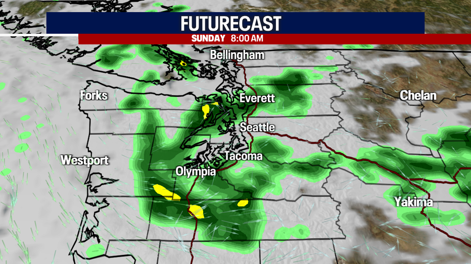Those showers will hang with us into the overnight hours allowing many communities to wake up to light to moderate rain Seafair Sunday.