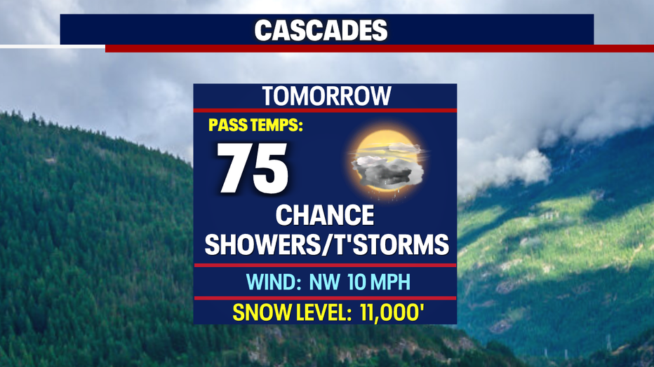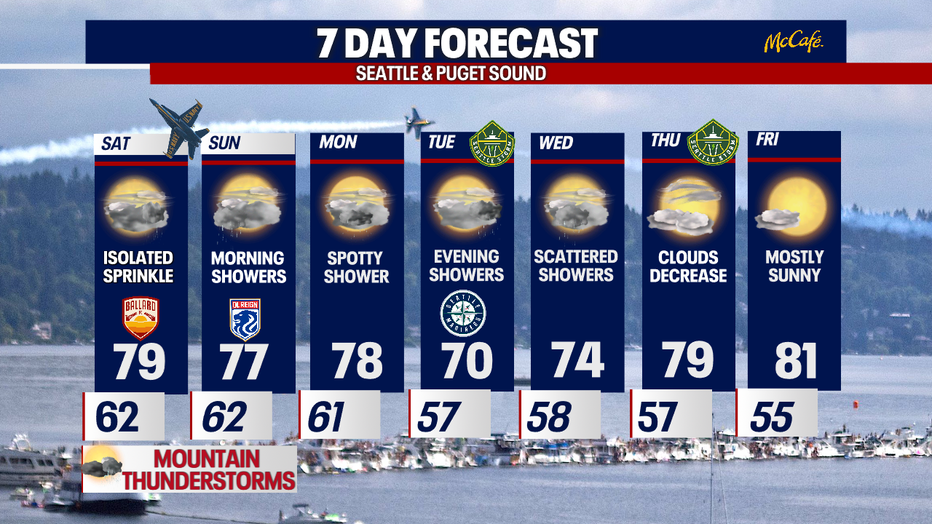 Highs on Seafair Sunday warm into the mid 70 with humid conditions. And we'll hang on to the chance for thunderstorms over the Cascades with some possibly spilling into the lowlands.