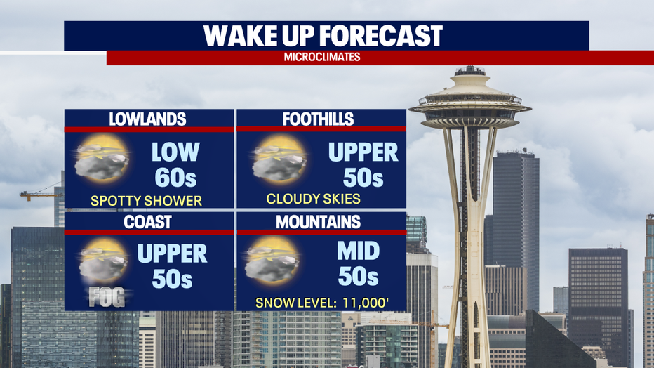 Wake-up temperatures for the Central Sound start in the low 60s with slightly cooler conditions everywhere else.