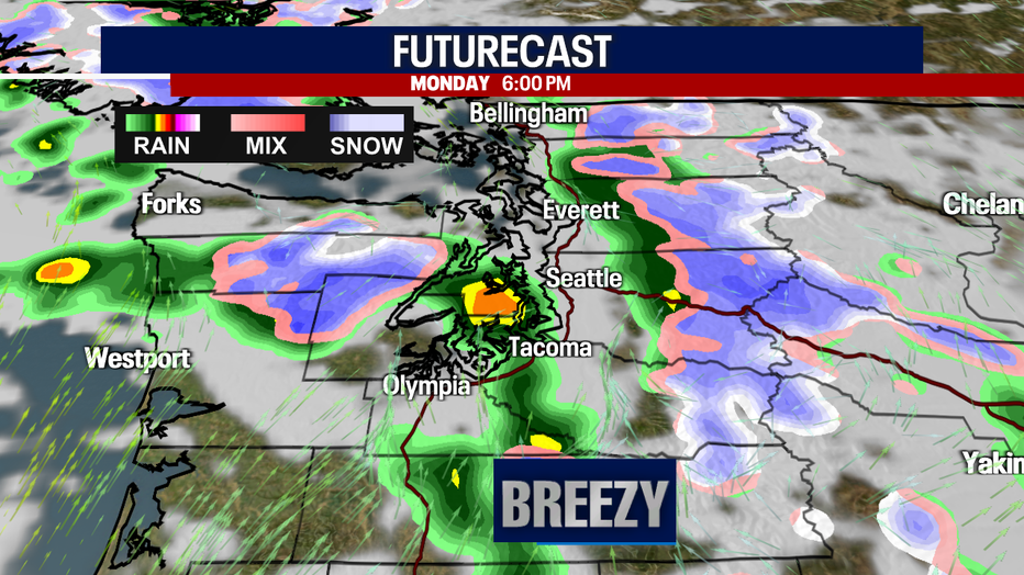 The rain, clouds and breezy conditions are making temperatures feel cooler. Highs will only lift to the upper 40s and low 50s. An incoming cold front could fire off some scattered, weak thunderstorms today as well. Small hail, graupel and lightning could mix with rain today. Any sunbreaks will help "fuel" the storms. Later this evening, light snow is in the forecast for the passes.